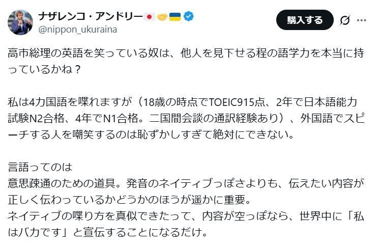 アンドリー氏は「高市総理の英語を笑っている奴は、他人を見下せる程の語学力を本当に持っているかね?」と批判的なコメントに疑問を投げかけ、「私は4カ国語を喋れますが(18歳の時点でTOEIC915点、2年で日本語能力試験N2合格、4年でN1合格。二国間会談の通訳経験あり)、外国語でスピーチする人を嘲笑するのは恥ずかしすぎて絶対にできない」とした。