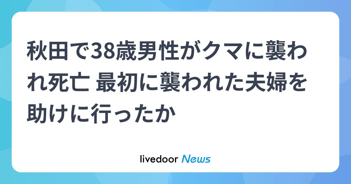 秋田のクマ被害、死亡は38歳男性 - ライブドアニュース秋田県警によると、同県東成瀬村でクマに襲われ死亡した男性は同村の佐々木喜行さん(38)と確認した。最初に襲われた70代夫婦を助けに行った可能性があり、顔や頭にクマに引っかかれたとみられる深い傷があった。news.livedoor.com - 2 : 2025/10/24(金) 21:16:32.16 ID:FsZwaARo0