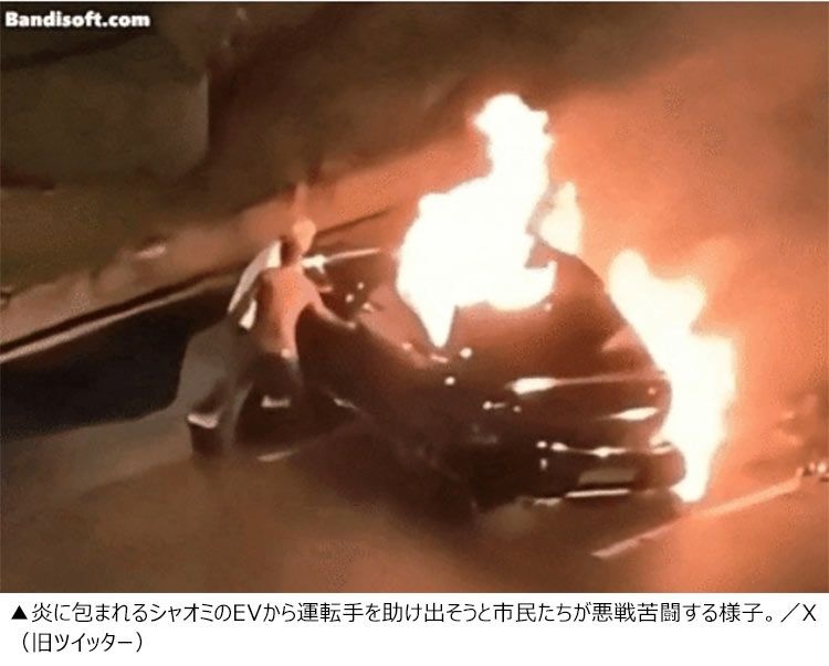 【写真】炎を上げるシャオミEV車両から運転手を救出しようとする市民たち