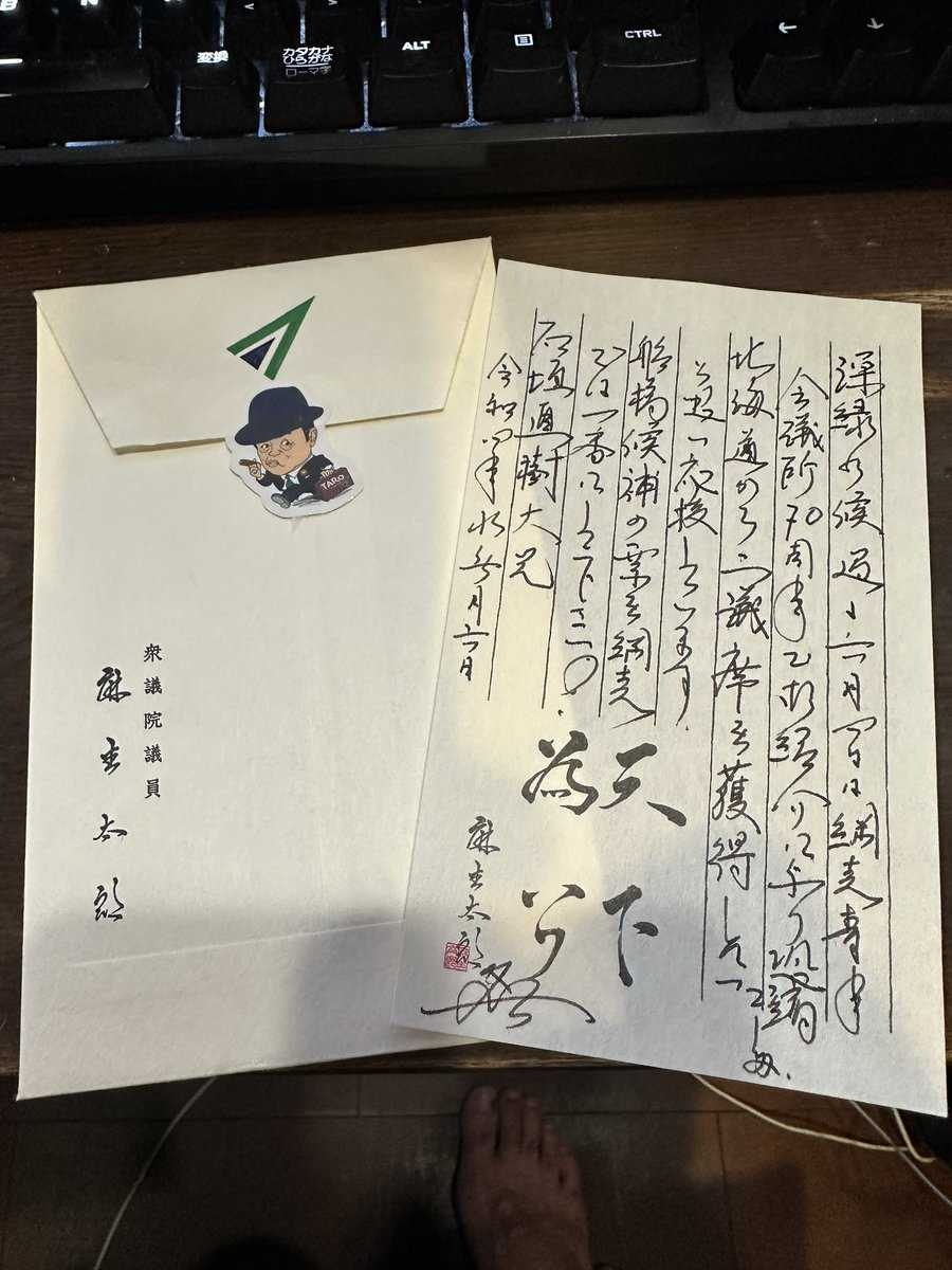 10月7日、自民党の北海道網走市議会議員・石垣直樹氏が自身のXを更新。同党に所属する麻生太郎氏から手紙をもらったと報告した。