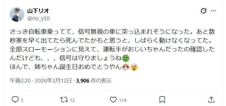 山下は「さっき自転車乗ってて、信号無視の車に突っ込まれそうになった」と書き出し、「あと数秒家を早く出てたら死んでたかもと思うと、しばらく動けなくなってた」と、ぼう然とした様子を振り返った。