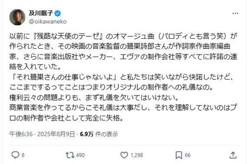 及川氏は、当該映画の音楽監督だった鷺巣氏の真摯な許諾申請について「『それ鷺巣さんの仕事じゃないよ』と私たちは笑いながら快諾したけど、ここまでするってことはつまりオリジナルの制作者への礼儀なの」と指摘。「権利云々の問題よりも、まず礼儀を欠いてはいけない。商業音楽を作ってるからこそ礼儀は大事だし、それを理解してないのはプロの制作者や会社として完全に失格」と、つづった。