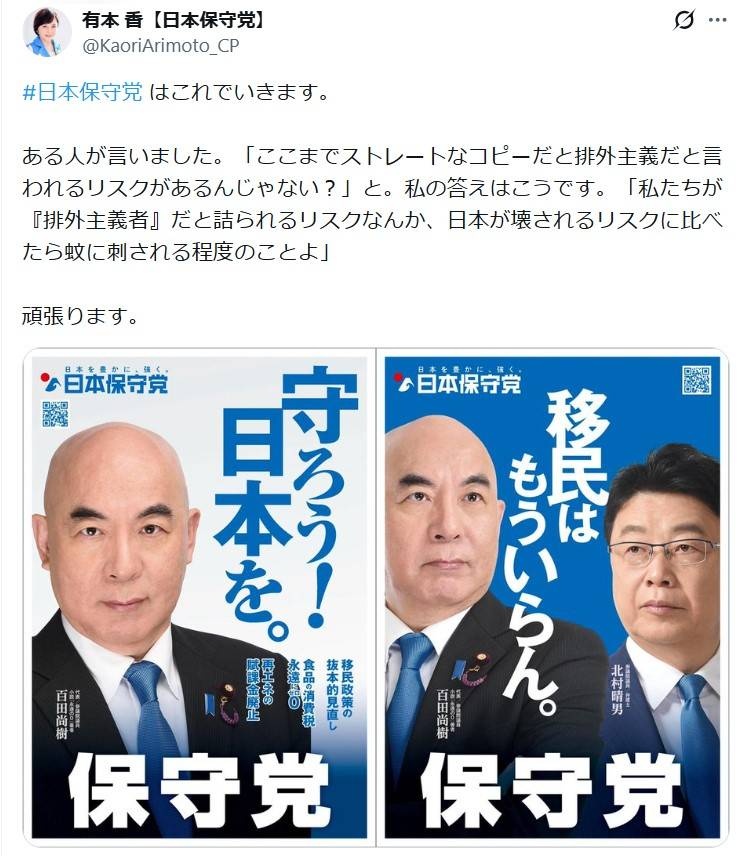 有本氏は「ある人が言いました。『ここまでストレートなコピーだと排外主義だと言われるリスクがあるんじゃない?』と。私の答えはこうです。『私たちが『排外主義者』だと詰められるリスクなんか、日本が壊されるリスクに比べたら蚊に刺される程度のことよ』」とつづり、最後は「頑張ります」と締めくくった。