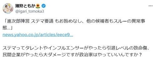 【女性アイドル】「ステマってタレントやインフルエンサーがやったら引退レベルの致命傷、民間企業がやったら大ダメージですが政治家はやっていいんですか?」