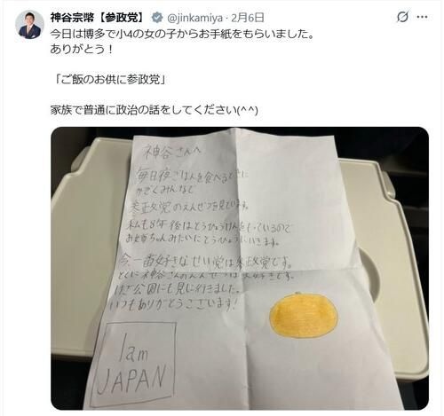 【小4の女の子が参政党の神谷宗幣代表に手紙】「神谷さんへ ご飯を食べるときに家族みんなで参政党のえんぜつを見ています。今一番好きなせい党は参政党です。とくに神谷さんのえんぜつは大好きです。I am JAPAN」