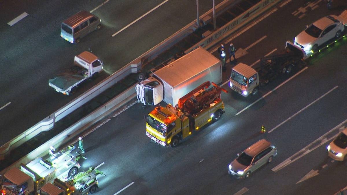 警視庁などによりますと、トラックが走行中の車に次々とぶつかり横転したとみられています。