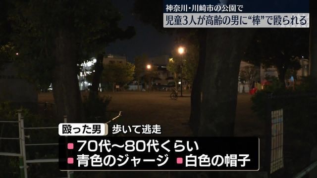 【神奈川】小学生の男子児童ら3人が男(70代~80代)に棒状のもので殴られ軽傷、男は現場の公園から逃走