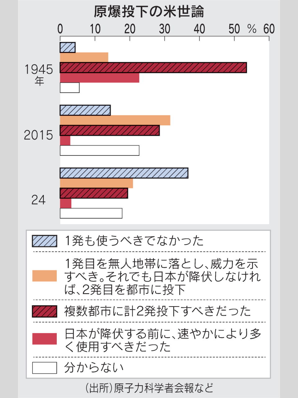 日本経済新聞 電子版(日経電子版) (@nikkei) on X原爆投下、アメリカ世論は3割反対 1945年8月9日、アメリカのトルーマン大統領が原爆の実戦投入を正当化してから80年。「1発も原爆を使うべきでなかった」とする回答が1945年の4%から、2024年の調査では36%に上昇しました。x.com - 2 : 2025/08/06(水) 00:26:10.03 ID:iz7DG0750