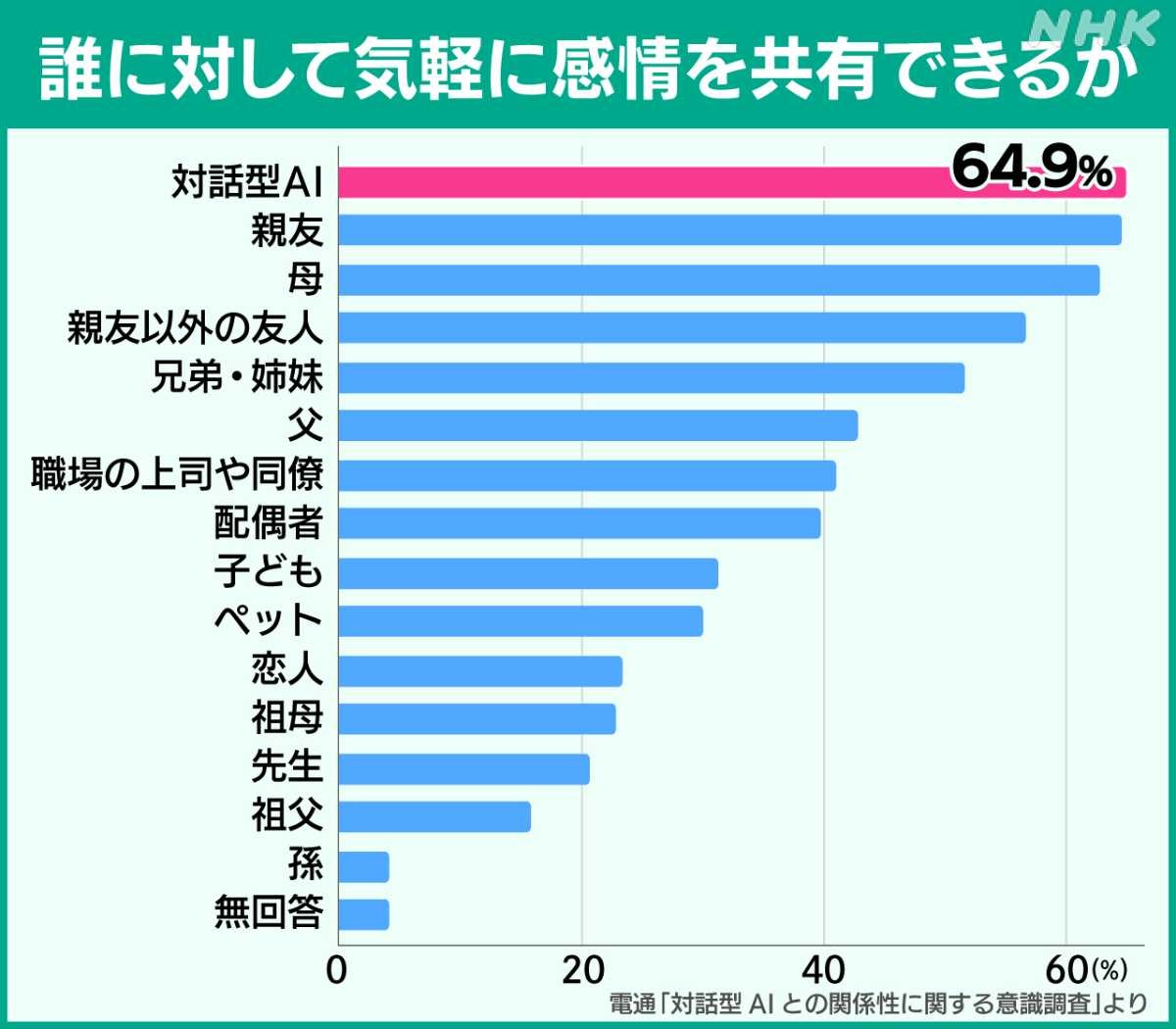 生成AIはドラえもんみたいなイメージです。何でも解決してくれる頼りになる存在みたいな。これなしとかもう無理です」大手広告会社が対話型AIを週1回以上使っている全国1000人を対象に「だれに対して気軽に感情を共有できるか」を聞いた調査では、AIと回答した人はおよそ65%に上り、親友や母親などほかの項目を抑え、最も多くなりました。
