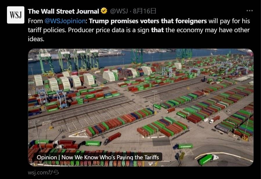 まさか、WSJ紙が知らなかったわけではないだろうが、トランプ政権は諸外国に課している関税は輸出国が負担するものだと国民をいわば洗脳していたのが、ここへきて関税が米国の物価に悪影響を及ぼし始めると、ようやく自分たちが支払うものだということを自覚し出したというのだ。