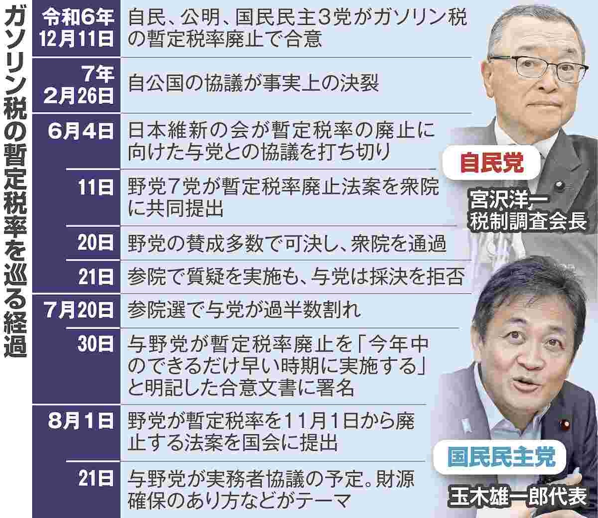 だが、与党は7月の参院選でも過半数割れし、態度を軟化。与野党は暫定税率廃止を「今年中のできるだけ早い時期に実施する」ことで合意した。野党は8月の臨時国会に暫定税率を11月1日から廃止する法案を提出しており、秋の臨時国会での法案成立を目指す。