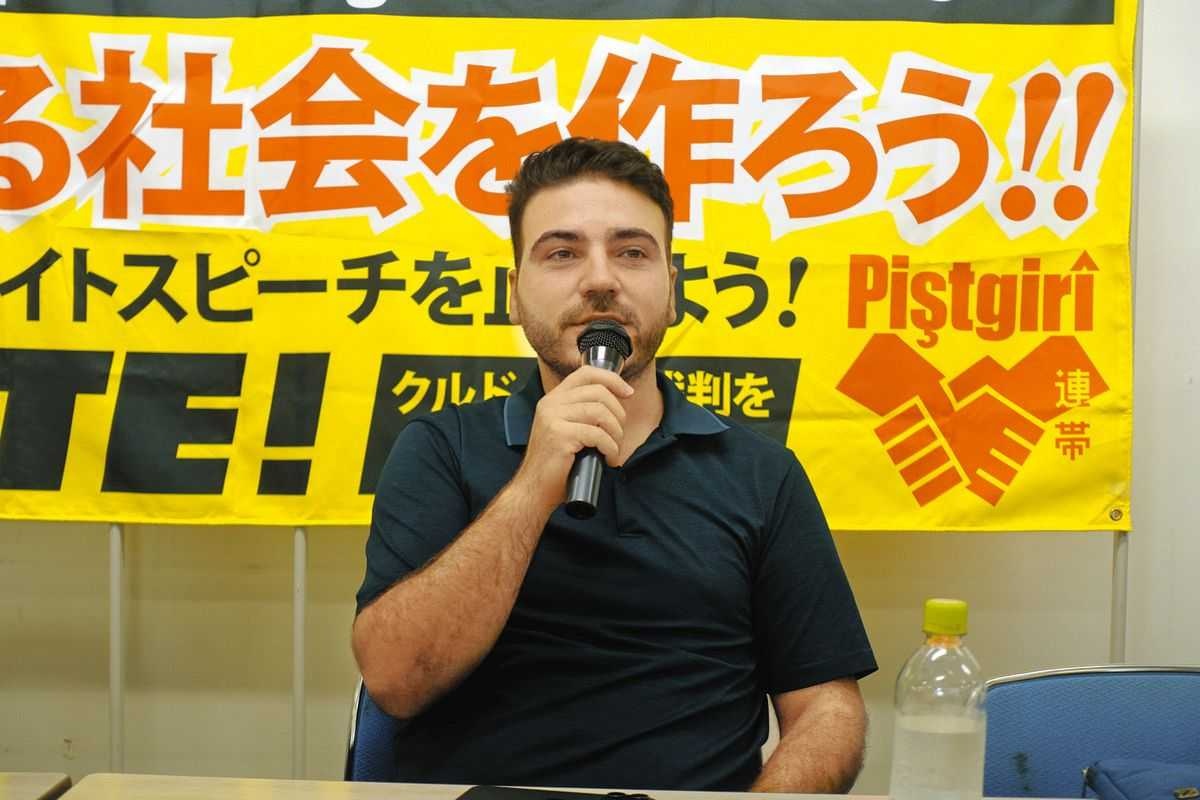 閉廷後の支援者集会でヘイトの現状を訴える日本クルド文化協会のシカン・ワッカス会長=24日、さいたま市で