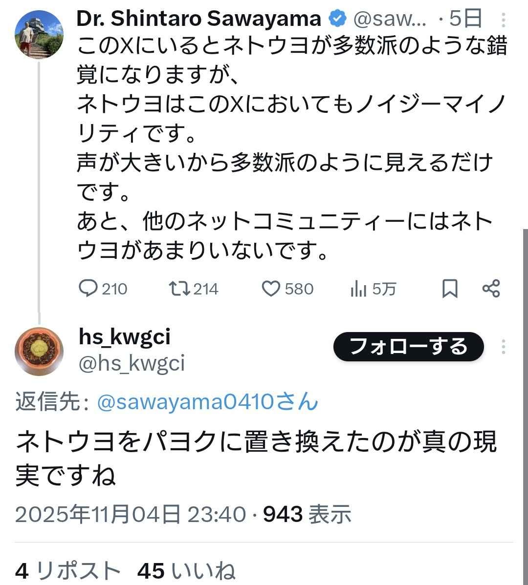 パヨさんたちが普通の日本人をネトウヨ認定して仮想敵を増やしてるだけで - 21 : 2025/11/09(日) 20:10:52.72 ID:fwCVnAWs0