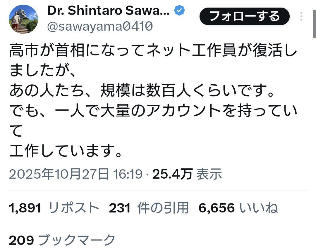 パさん「高市が首相になってネット工作員が復活しました。一人で大量のアカウント持ってます」