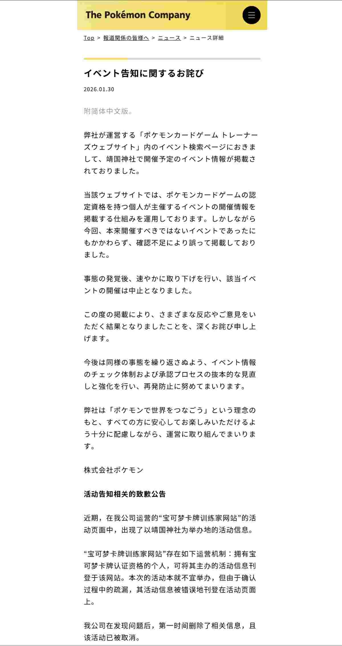 イベント告知に関するお詫び|株式会社ポケモン|The Pokémon Companyポケモンという存在を通して、現実世界と仮想世界の両方を豊かにすること。株式会社ポケモンのコーポレートサイトです。corporate.pokemon.co.jp - 4 : 2026/01/30(金) 21:40:42.89 ID:2qYXFn7X0