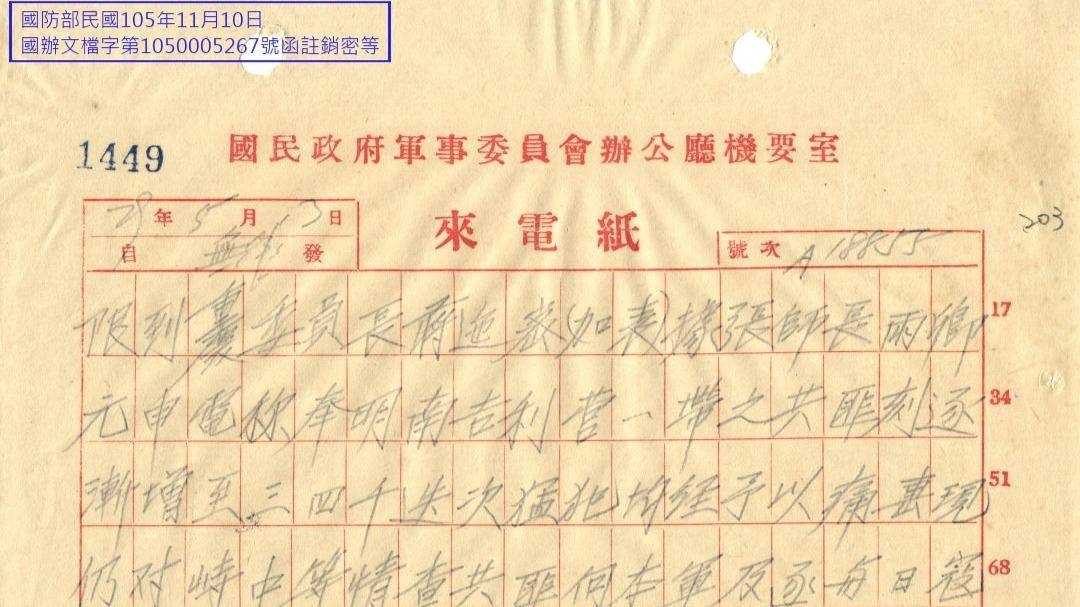 台湾の「国史館档案史料文物査詢系統」で、中華民国27年6月(1938年6月)から中華民国33年6月(1944年6月)にかけての抗日戦争での戦場手書き極秘報告集(電報)が機密解除されていたのを発見した