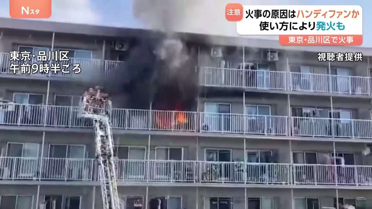 けさ、東京・品川区の10階建てのマンションで火事があり、男女6人が軽いけがをしました。充電中の手持ち型扇風機から出火したとみられています。