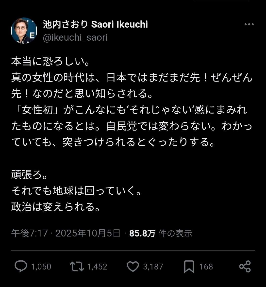 真の女性とかいう男性軽視したいだけの差別主義者が首相になったら大変だよ