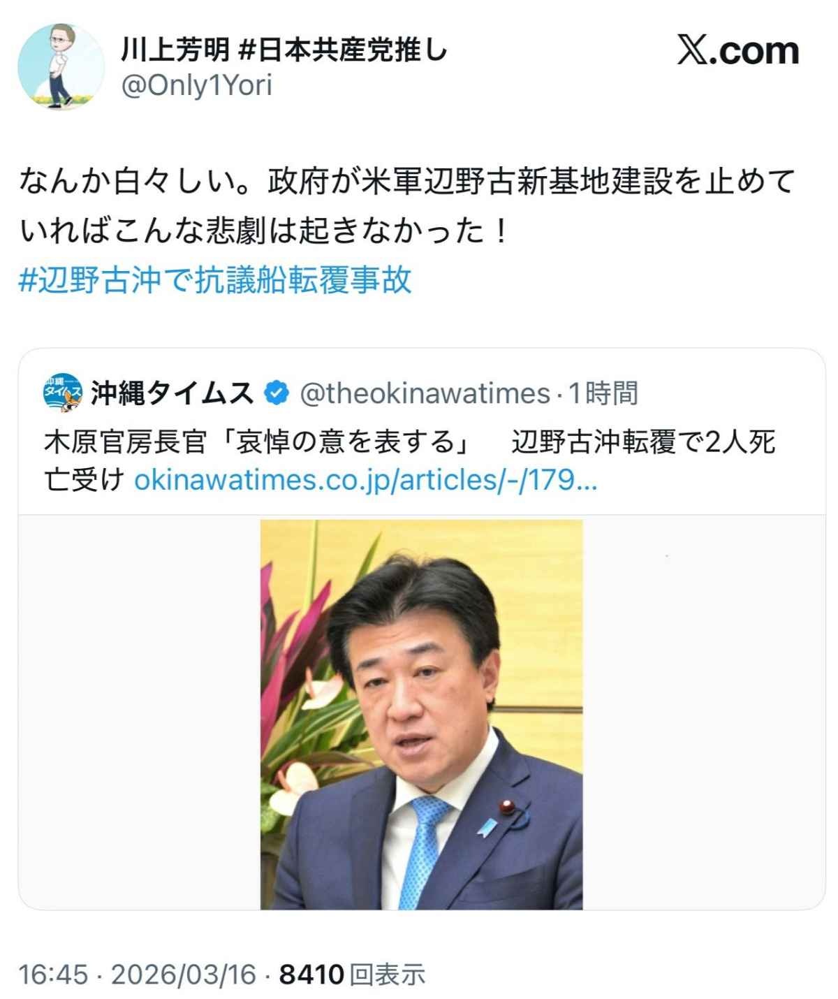 共産党支持者「政府が米軍辺野古新基地建設を止めていればこんな悲劇は起きなかった!」
