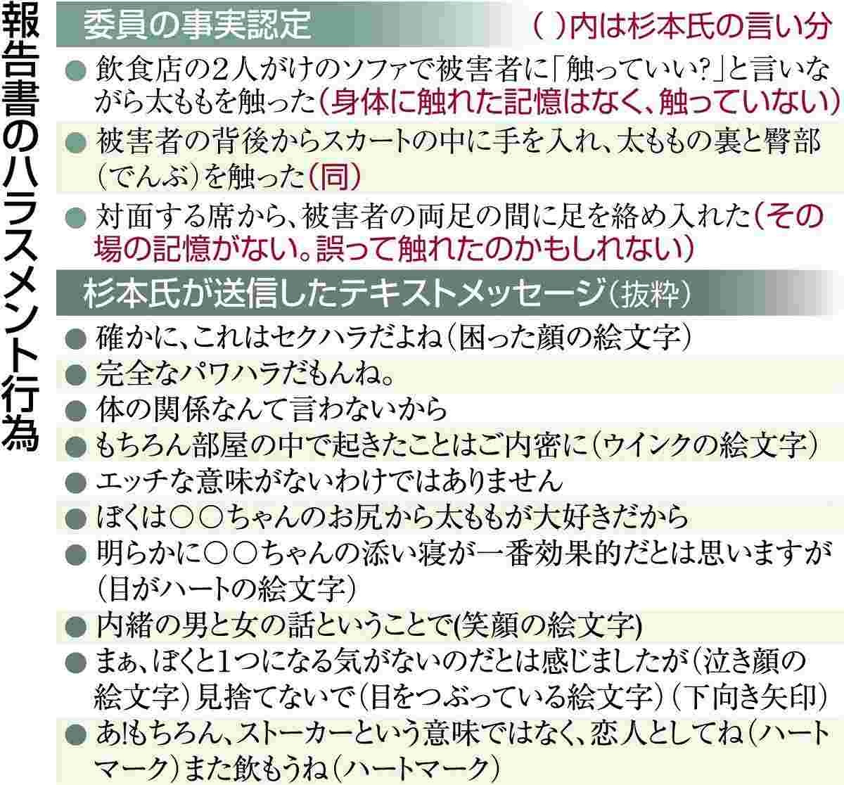 杉本氏からの無料通信アプリ「LINE(ライン)」やメールのメッセージを調べたところ「愛してる」「いま、なぜか無性に○○ちゃんを抱き締めたいよ」など、セクハラを裏付ける内容のものが約1000通に上った。調査委員は「嫌がる相手に、しつこく性的嫌がらせを続けることに執着している」と批判した。