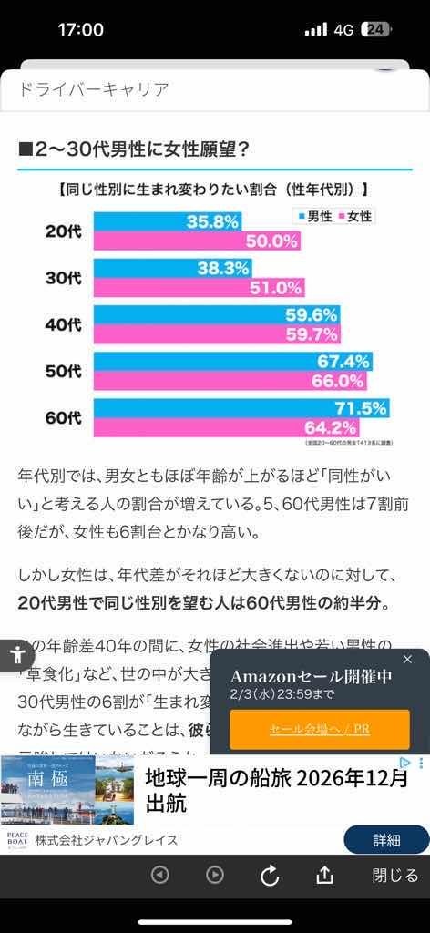 女になりたい男が激増 20代 同じ性別に生まれたい 男36% 女50%