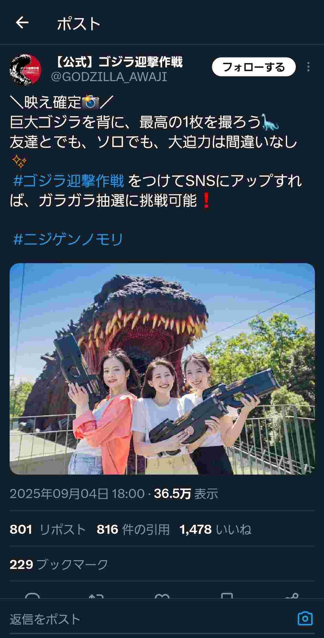 【公式】ゴジラ迎撃作戦 (@GODZILLA_AWAJI) on X\映え確定📸/ 巨大ゴジラを背に、最高の1枚を撮ろう🦕 友達とでも、ソロでも、大迫力は間違いなし✨ #ゴジラ迎撃作戦 をつけてSNSにアップすれば、ガラガラ抽選に挑戦可能❗ #ニジゲンノモリx.com - 3 : 2025/09/05(金) 12:17:10.79 ID:bx7Ewk3W0