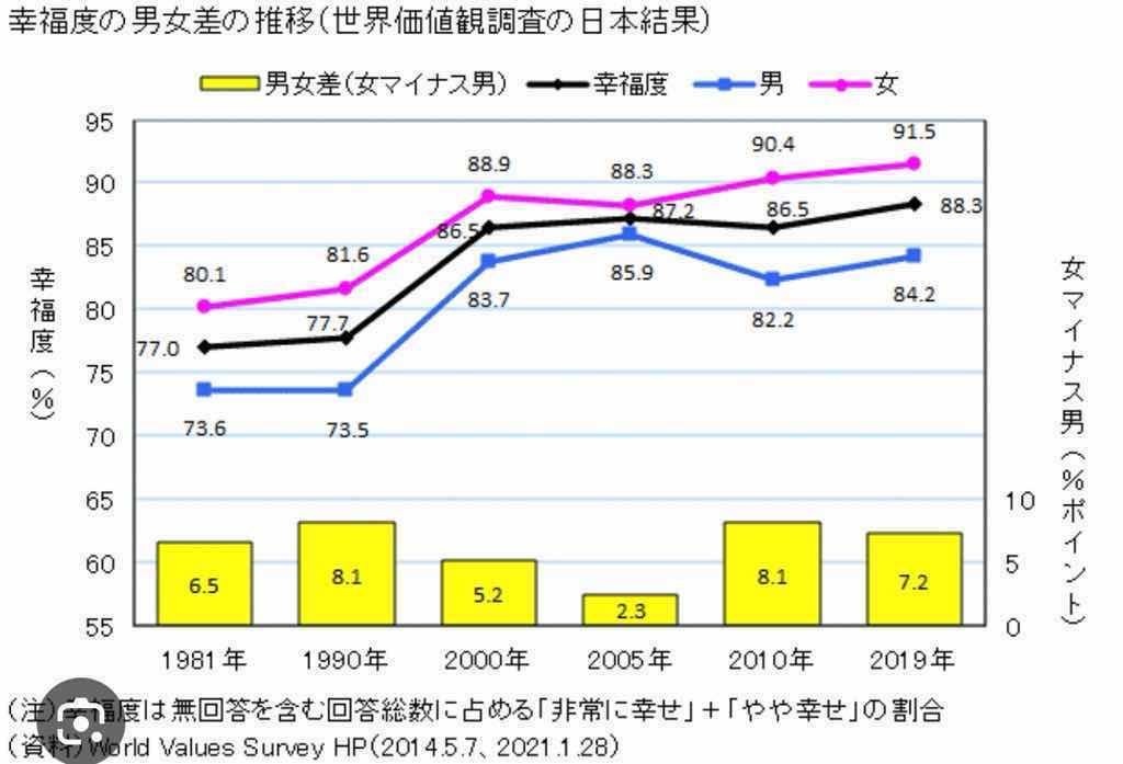 女の幸福度 過去最高 女91% 男84% 現代の日本は女にとって最高と判明😢