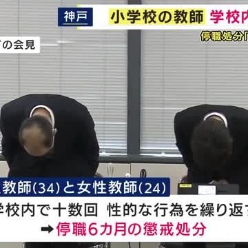 神戸市教育委員会は、小学校内で性行為をしたとして34歳の男性教師と24歳の女性教師を停職6か月の懲戒処分としました。