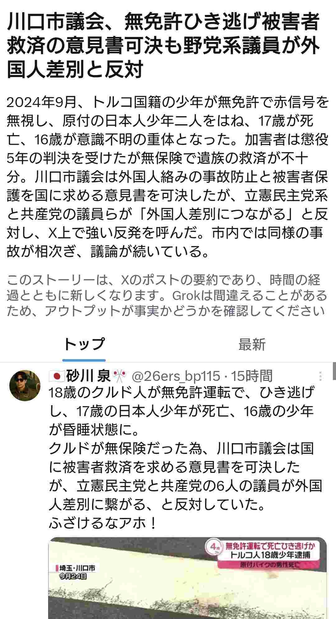 川口市議会、無免許ひき逃げ被害者救済の意見書可決も野党系議員が外国人差別と反対