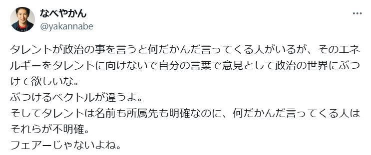 お笑いタレント、なべやかん(54)が21日までにX(旧ツイッター)を更新。政治的発言をする芸能人への批判に言及した。