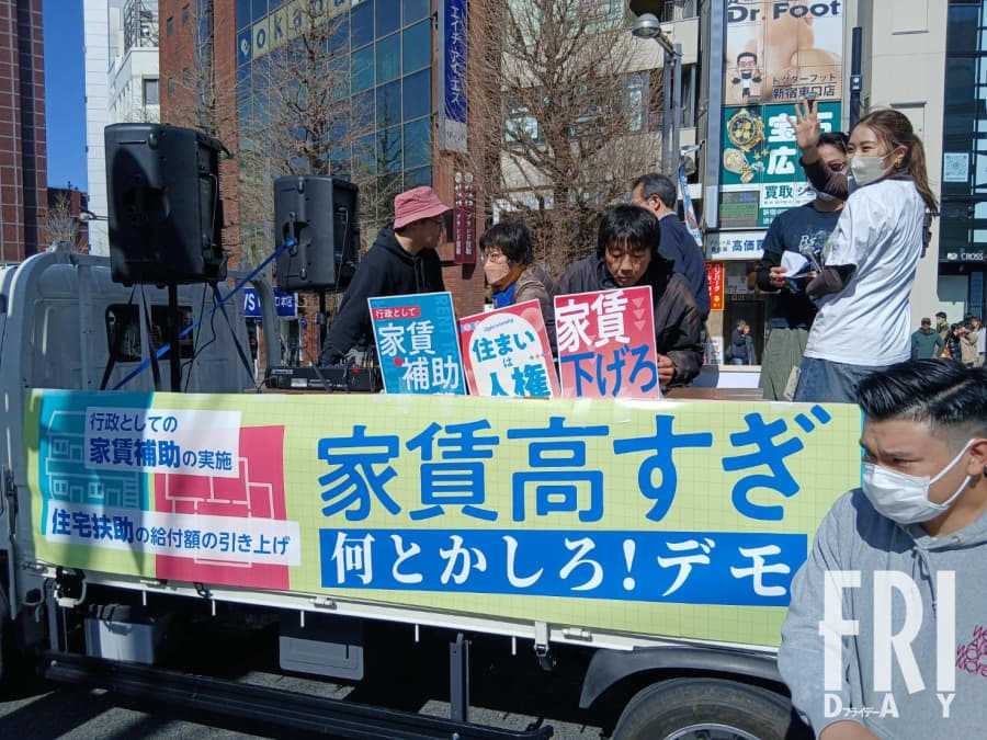 3月14日、新宿駅東口で「家賃高すぎ。なんとかしろ!デモ」が開催。住まいの貧困ネットワークと首都圏青年ユニオンの主催によるものだ。
