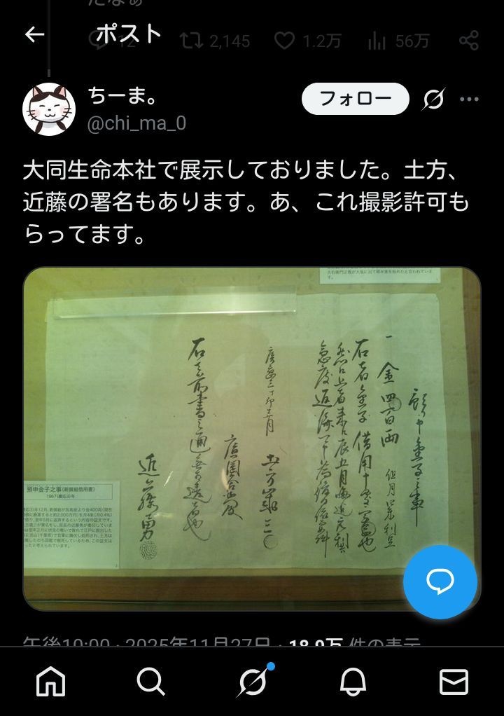 @rererumba 大同生命本社で展示しておりました。土方、近藤の署名もあります。あ、これ撮影許可もらってます。