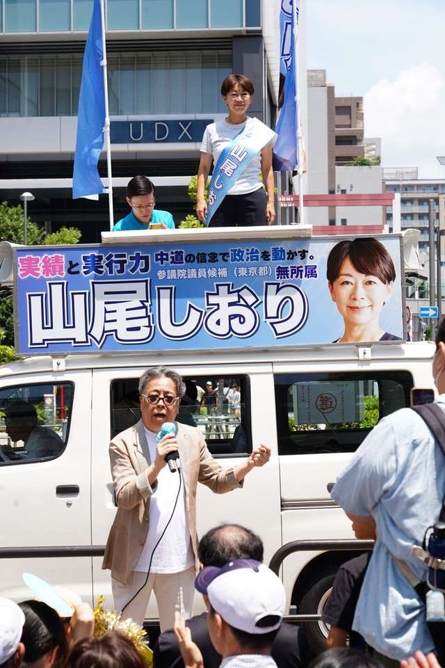 参院選(20日投開票)に東京選挙区から無所属で出馬している山尾志桜里元衆院議員(50)が13日、東京・秋葉原の駅前で街頭演説を実施。「おぼっちゃまくん」「ゴーマニズム宣言」などの作者として知られる漫画家・小林よしのり氏(71)が応援にかけつけ、有権者に訴えかけた。