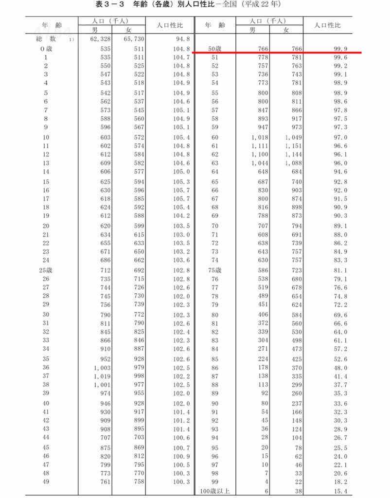 50歳 男99.9人:女100人