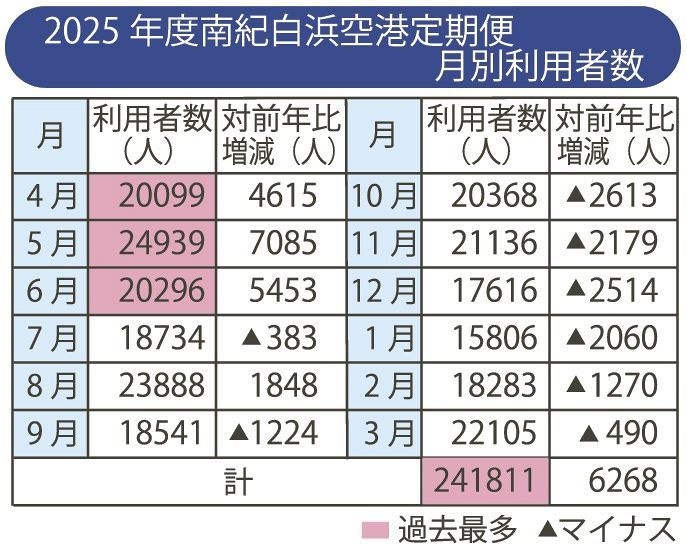 一方、25年度の月別利用者数は、4月から6月は過去最多だったが、7月以降は、8月を除いて前年度を下回った。白浜町のレジャー施設「アドベンチャーワールド」で飼育されていたパンダ全4頭が6月下旬に返還されたことが影響したとみられる。8月については、南海トラフ地震臨時情報が発表された前年より上回った。