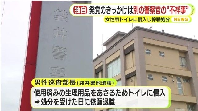 男性巡査部長は使用済みの生理用品をあさるためトイレに侵入していて、処分を受けた日に依願退職しています。