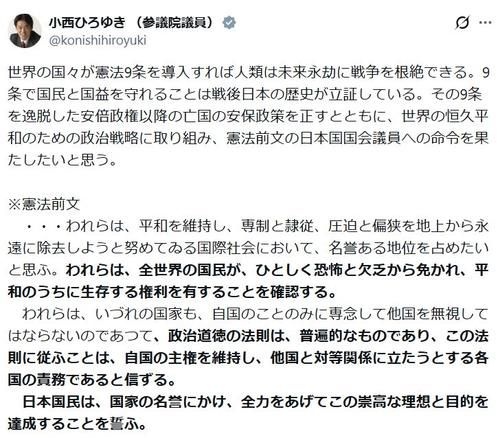 立憲議員「世界の国々が憲法9条を導入すれば人類は未来永劫に戦争を根絶できる」投稿に様々な声 (小西洋之参院議員)