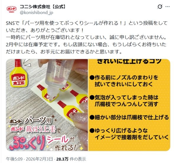 「ぷっくりシール自作に最適」SNSで話題のボンド品薄、コニシが謝罪「2月中には在庫予定」