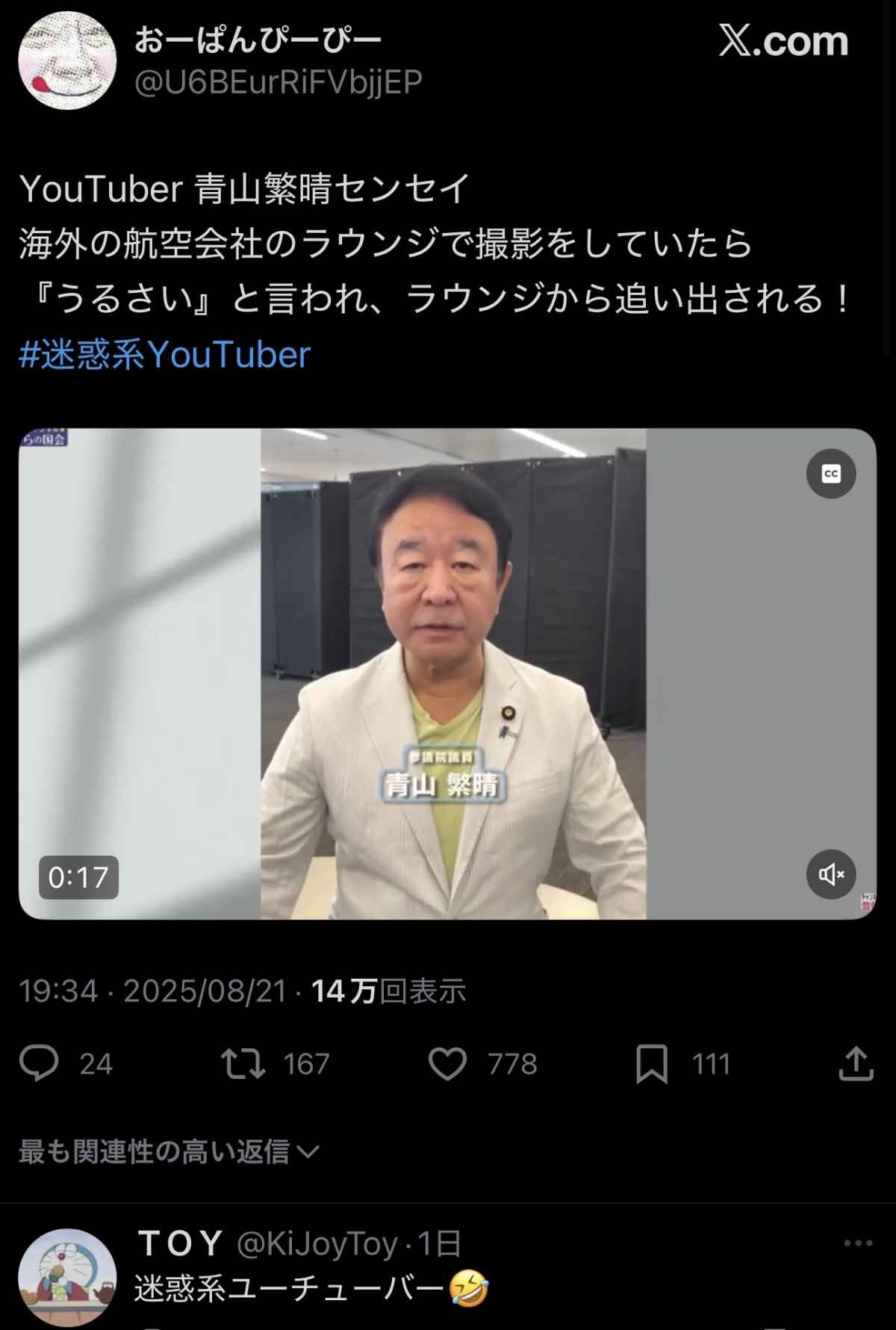 青山繁晴議員、海外の空港ラウンジで撮影していたところ「うるさい」と言われ追い出されるwww