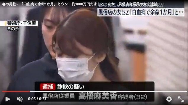 客の男性に「白血病で余命1か月」とウソ…約1000万円だましとったか 風俗店従業員の女を逮捕(日テレNEWS NNN) - Yahoo!ニュース風俗店従業員の32歳の女が客の男性に「白血病が再発し余命が1か月しかない」などとウソを言って、およそ1000万円をだましとったとして逮捕されました。 警視庁によりますと、風俗店従業員の高橋麻美香容news.yahoo.co.jp - 4 : 2025/12/02(火) 11:03:02.20 ID:vvmGwqag0