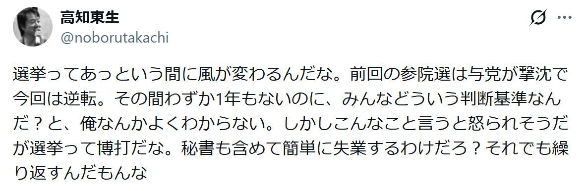 高知東生「前回の参院選は与党が撃沈で今回は逆転。みんなどういう判断基準なんだ?」