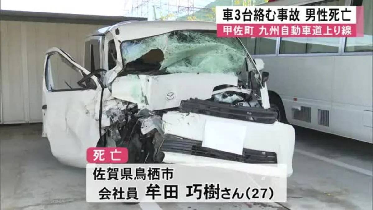 この事故で、トラックに追突した乗用車を運転していた佐賀県に住む、牟田巧樹(27)さんが、腹部を強く打ったとみられ、運ばれた病院で死亡しました。