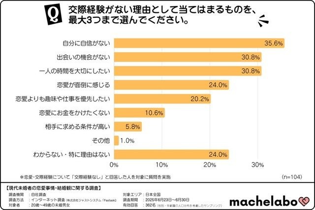 に関する調査によると、20代女性の半数が「交際中」と答えたのに対し、30代男性の4割弱は「交際経験ゼロ」と、